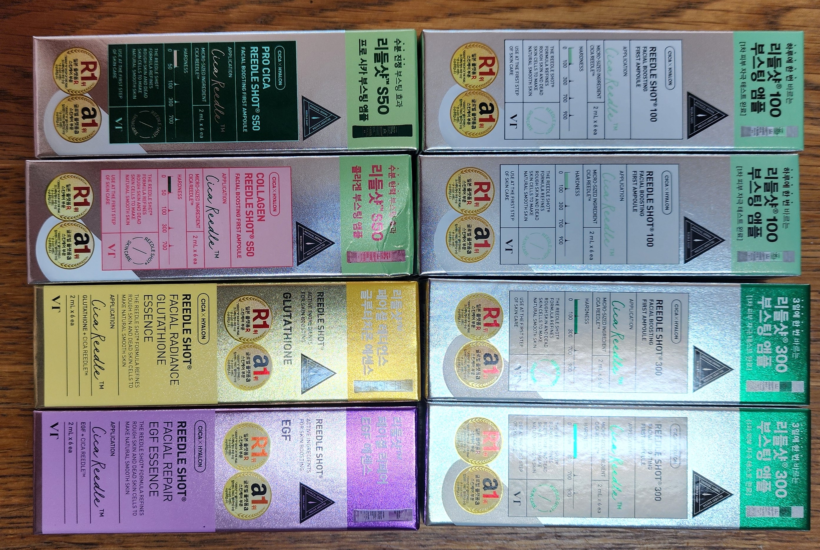 리들샷이 숫자가 클수록 아플 수 있다고 해서 가장 낮은 50부터 300까지 구입해서 차례대로 써 볼 예정이구요, 이번에 신신제품으로 콜라겐, 시카, EGF, 글루타치온, 펩타이드 등 신상 리들샷이 출시돼서 다양하게 구입했어요. 리들샷 500도 새로 출시했지만 품절이어서 구입 못했네요. 미세침이 피부 속 깊숙이 침투하여 모공을 막고 있던 노폐물을 제거해주고, 피부 탄력을 개선해 준다고 해서 꾸준하게 사용해 볼 계획이랍니다.