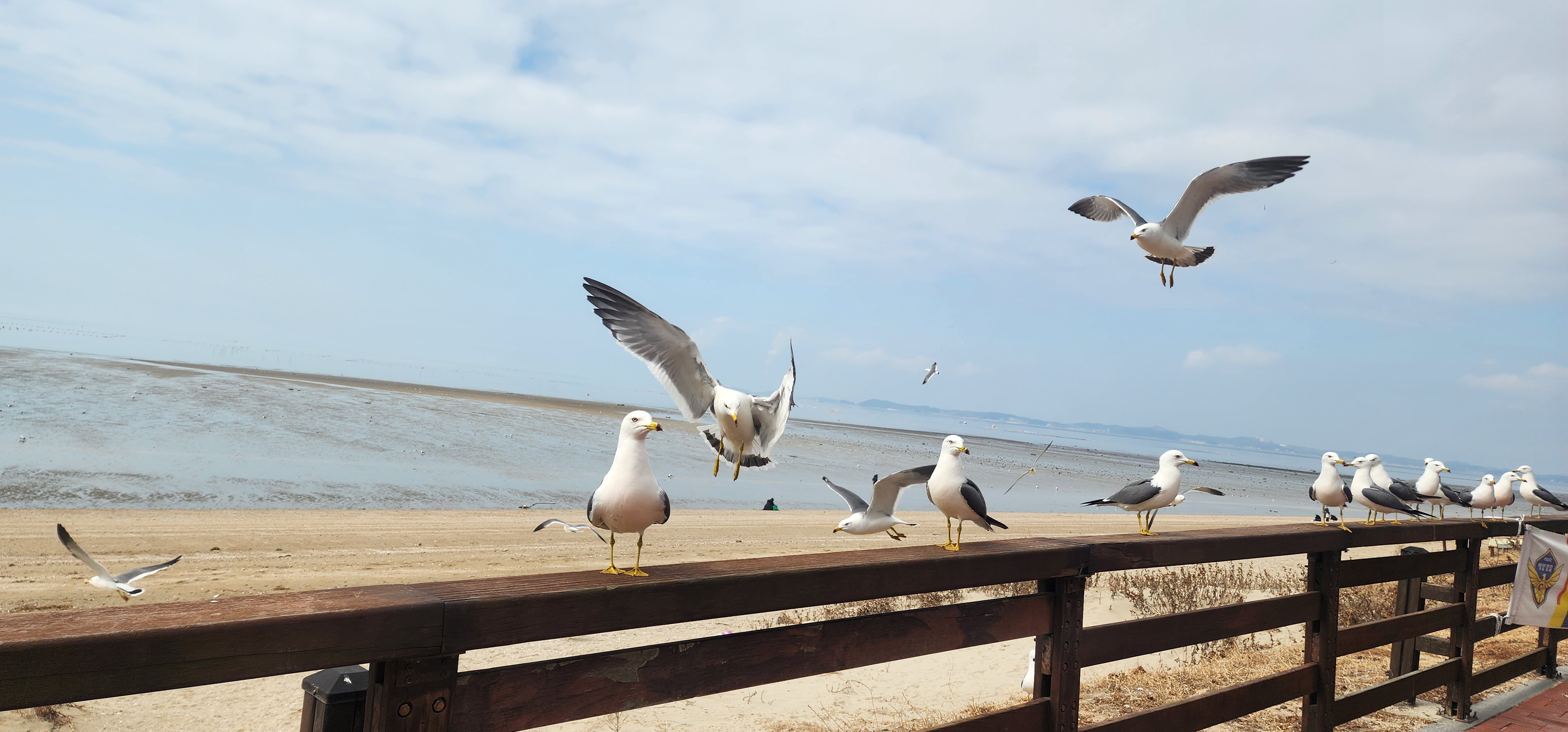 아직은 추운 겨울이라 바다는 그저 구경만 하다왔네요. 물이 빠진 바닷가 갯벌에는 갈매기들이 많이 앉아 있어서 보는 재미가 있었습니다. 주변에 아이들과 함께 온 가족은 새우깡을 주기도 하더라구요.