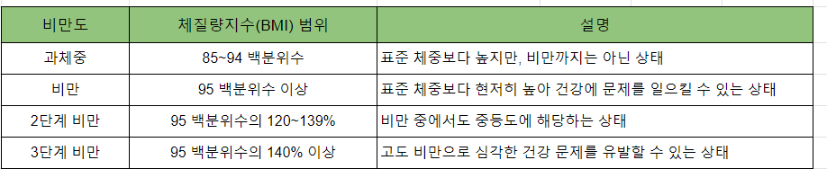 - 활용 방법: 계산한 BMI 값을 표준성장도표의 해당하는 나이와 성별의 그래프에 대입하여 비만 여부 판단