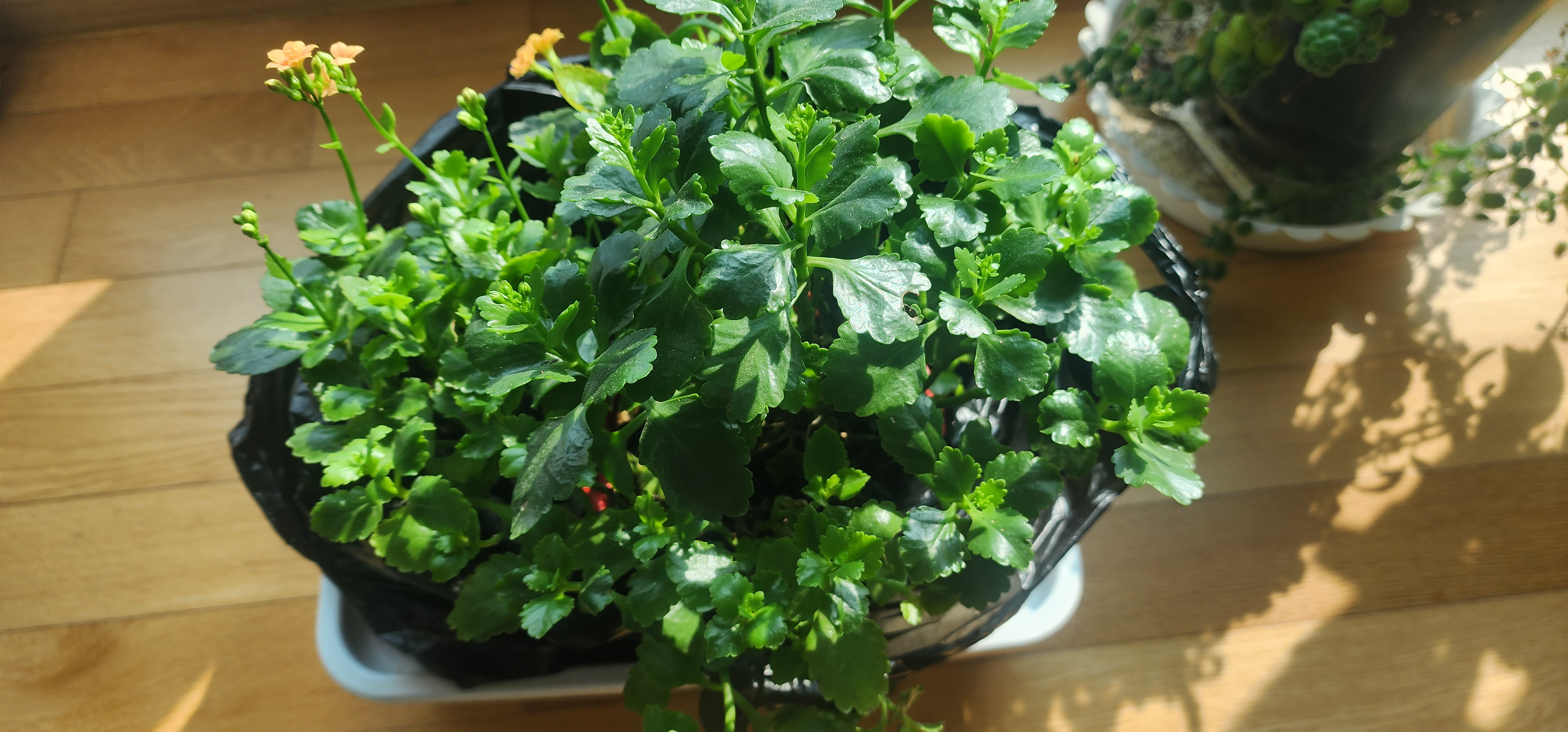 (분갈이 하기 위해 비닐봉투에 넣어 놓은 카랑코에, 꽃이 조금씩 피고 있어요~~)