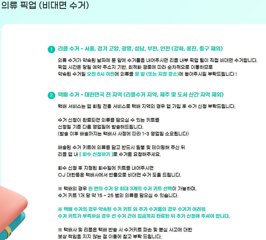 - 문 앞 수거: 지정된 날짜에 문 앞에 옷을 놓아두면 리클 직원이 직접 수거해 갑니다.