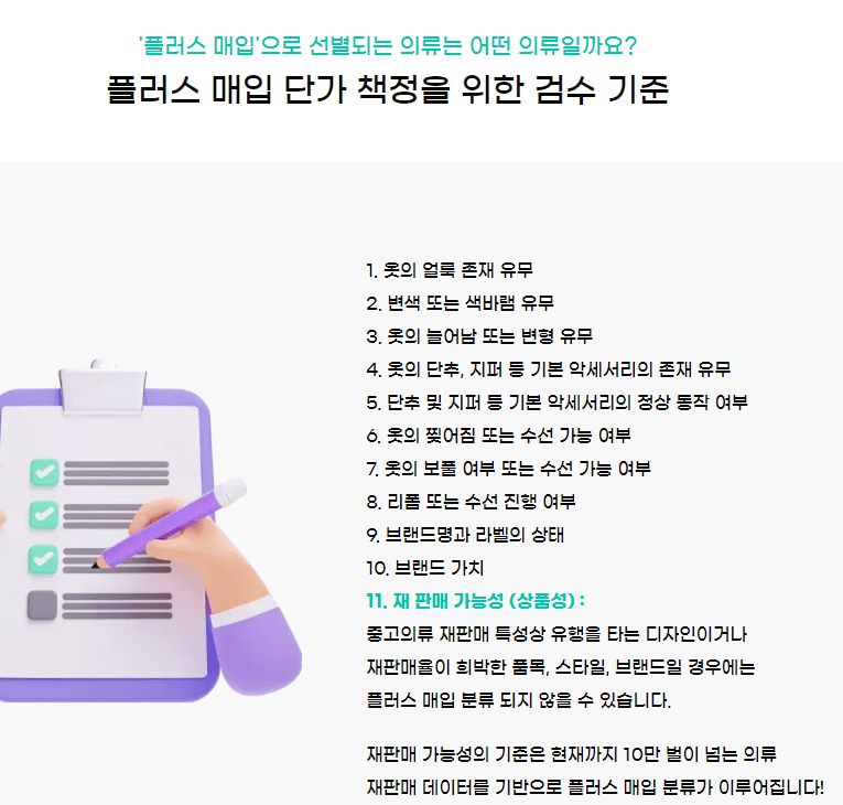 - 매입 시스템: 재판매 가능한 옷은 1벌씩 별도 매입하고, 나머지 옷은 무게 단위로 매입하여 현금으로 돌려받을 수 있습니다.