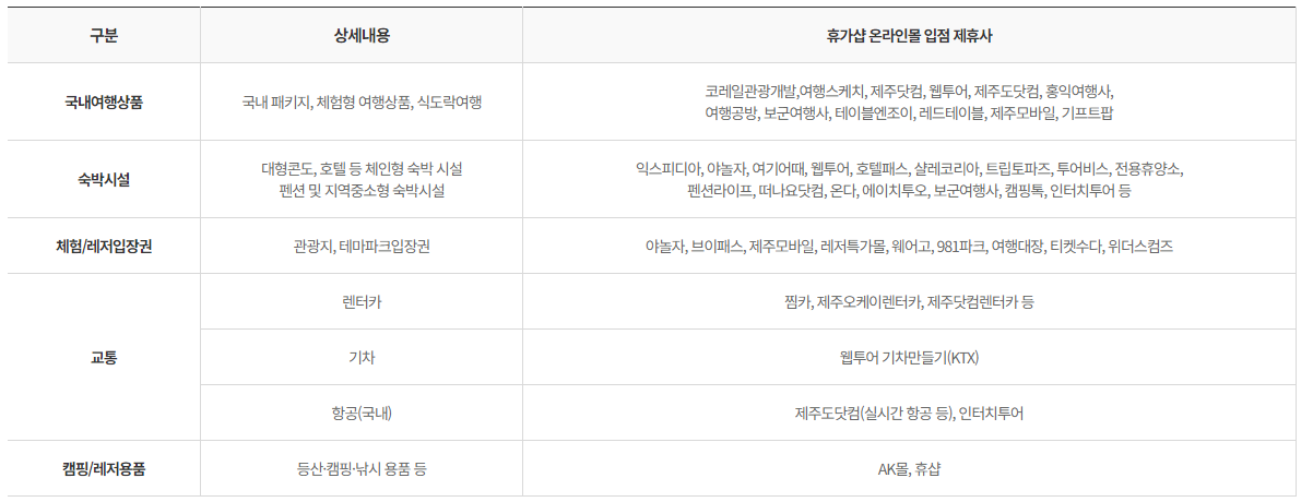 근로자는 휴가샵 온라인몰에서 개인회원 가입 후에 적립된 포인트 40만 원으로 숙박, 관광지, 입장권, 체험상품, 패키지 여행, 교통편 등 국내여행에 관련된 상품을 구입할 수 있어요. 적립된 포인트는 오직 '휴가샵'에서만 사용이 가능하고 사용기간은 2024년 12월 20일까지 입니다. 만약 모두 사용하지 못했을 경우 정부 분담비율 25%에 해당하는 금액을 제외하고 환불됩니다. 단, 휴가샵 내 서울, 경기, 인천 등 수도권 지역은 숙박 상품은 제외하고 이용이 가능합니다.(가평군, 연천군,강화군, 옹진군 제외)