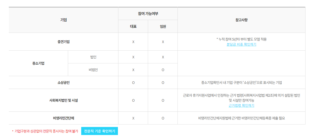 '근로자 휴가지원사업'은 근로자, 기업, 정부가 모두 함께하는 사업이기 때문에 근로자 개인만 신청하는 것은 불가능하며 기업이 먼저 참여한 후에 근로자가 참여할 수 있으며 참여가능여부는 아래표와 같습니다.