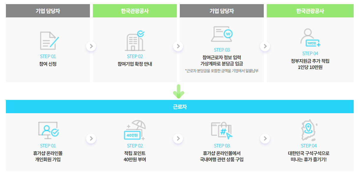 '근로자 휴가지원사업'을 참여하고자 하는 기업에서 참여 의사를 밖히기 위해 참여 신청서를 제출하면 한국관광공사에서 참여기업을 확정한 후 확정된 기업과 근로자가 분담금을 일괄 납부하면 정부지원금이 추가로 적립됩니다.