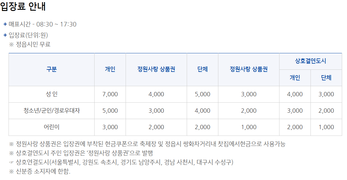 대부분의 구절초 축제 행사 입장료는 아래 표를 참고하시고, 일부 체험 프로그램은 참가비가 발생할 수 있습니다. 또한, 축제장 내에서 판매되는 지역 특산물이나 먹거리는 별도의 구매가 필요합니다. 미리 예산을 확인하고 방문 계획을 세우는 것이 좋습니다.