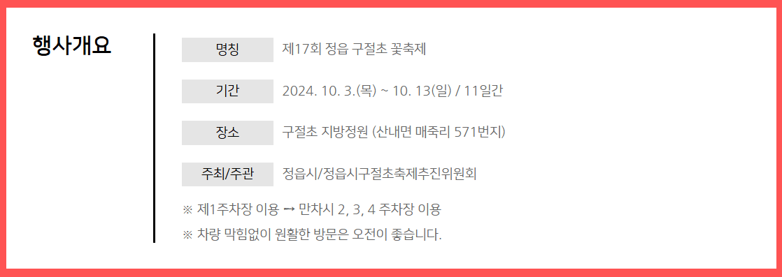 2024년 정읍 구절초 축제는 10월 3일부터 10월 13일까지 약 2주간 진행될 예정입니다. 매년 개최되는 이 축제는 날씨와 구절초 꽃의 개화 시기에 따라 일정이 다소 변동될 수 있으니, 방문 전에 공식 홈페이지나 SNS를 통해 정확한 일정을 확인하는 것이 좋습니다. 제가 축제 첫 날 갔는데 구절초가 거의 피지 않아서 실망했지만 그 대신 백일홍, 황화 코스모스, 일반 코스모스, 바늘꽃이 많아서 꽃 구경은 실컷 했네요.